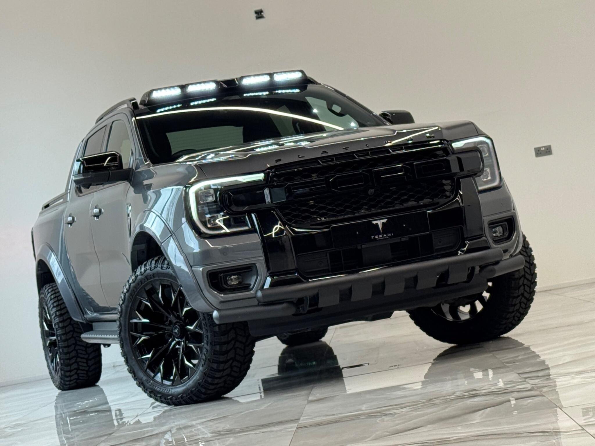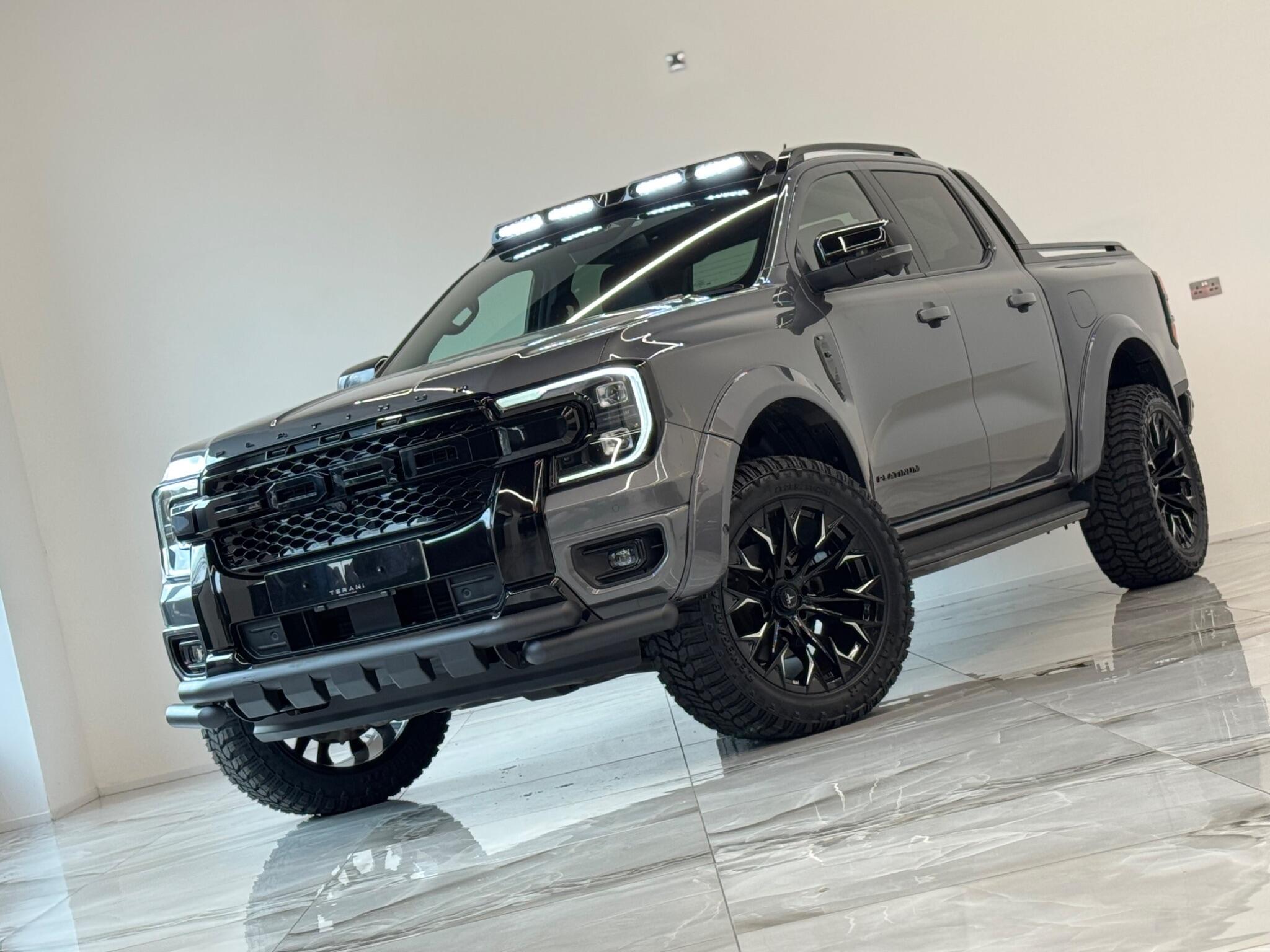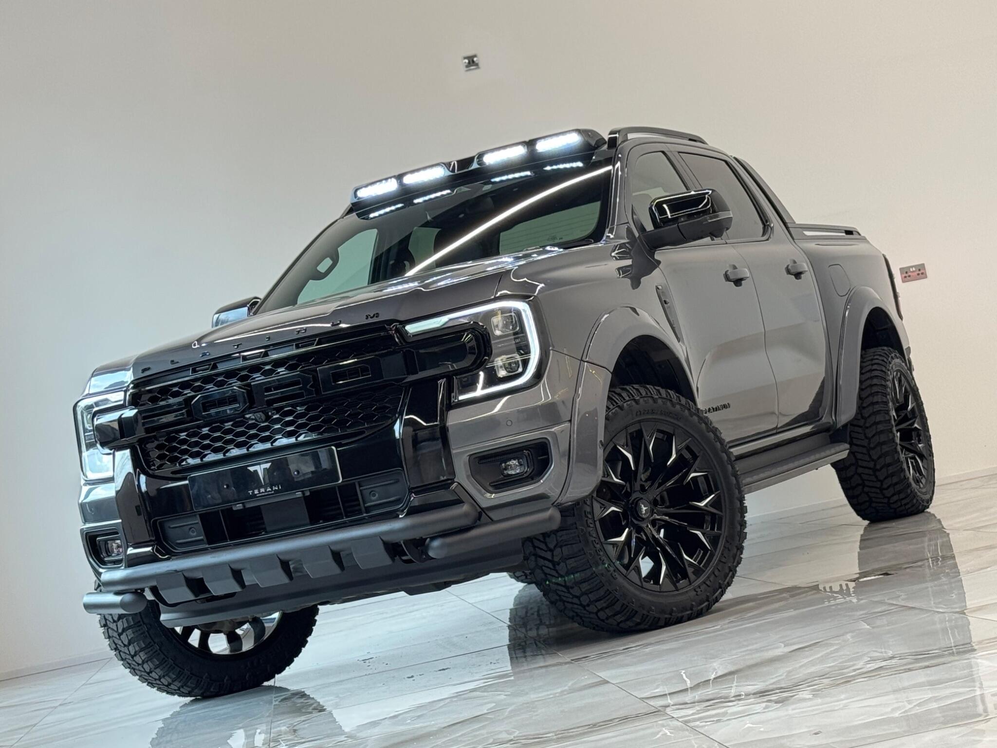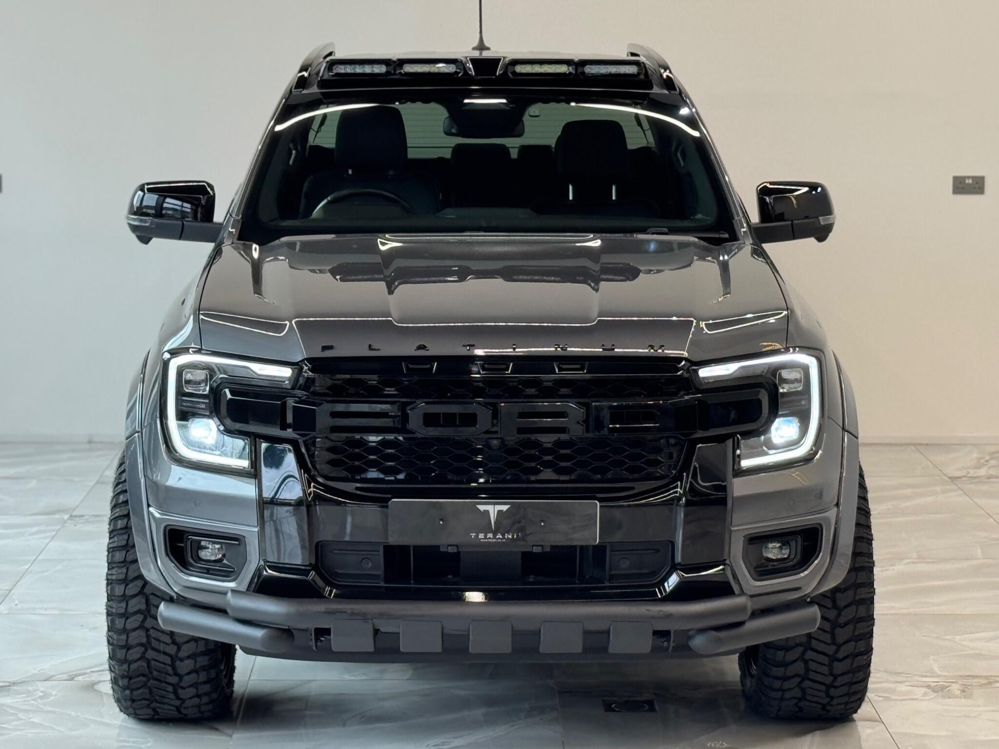 AVAILABLE IN STOCK UNDER CUSTOMISATION READY FOR 16TH MARCH|FORD RANGER 3.0 PLATINUM "CENTURIA" STONE GREY CUSTOMISED BY TERANI"""""" 1 OUT OF 1 IN UK""""""VIEWING STRONGLY ADVISED""""'MASSIVE SPEC""""AVAILABLE IN STOCK|£46990+VAT FINANCE 7.9% APR |COOLING/HEATED ELECTRIC SEATS|LED HEADLIGHTS|B&O SOUND SYSTEM|360 CAMERA AND PARK ASSIST|ELECTRIC ROLLER SHUTTER | ADAPTIVE CRUISE CONTROL|LANE ASSIST|ELECTRIC HEATED SEATS|APPLE CAR PLAY|HEATED STEERING WHEEL|REVERSE CAMERA |AUTO EMERGENCY BRAKE|AUTO HOLD|BLACK EXTERIOR PACK|WIDE ARCH KIT|OFF ROAD WHEELS|OFF ROAD MUD TYRES|LED ROOF LIGHT|UPGRADED LED INDICATING FOG LIGHTS|FRONT AND REAR LIGHTS PPF & GAURDS|CARBON UPGARDED INTERIOR TRIMS|FRONT BULL BAR..... VIEWINGS BY APPOINTMENT BASIS ONLY With exceptionally low mileage for its age, this 2023 Ford Ranger Platinum offers a superb ownership proposition. This four wheel drive, 3.0 litre diesel automatic pickup truck boasts a powerful 237 bhp engine and meets Euro 6 emission standards. It is equipped with the Technology Package 73, which includes Blind Spot Assistance, Adaptive Cruise Control, automatic headlights, and a 360 degree camera system for effortless parking. Further enhancing its practicality, it features front and rear parking sensors, a towbar, and a trailer tow class 1 rating, allowing for a substantial towing weight of 3500 kg. The Platinum trim level ensures a comfortable and convenient driving experience, highlighted by a heated steering wheel and passive keyless entry and start. The Power Pack 3 adds wireless phone charging, keeping your devices powered on the go. These features collectively demonstrate how this Ford Ranger Platinum surpasses other similar vehicles, offering advanced technology and premium comfort for both work and leisure.
